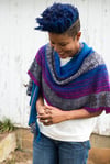 The Blue/Purple/Charcoal is in Luxe; 25% Silk/75% Merino, 400 yards/100g (color names Arda & Vulcan).